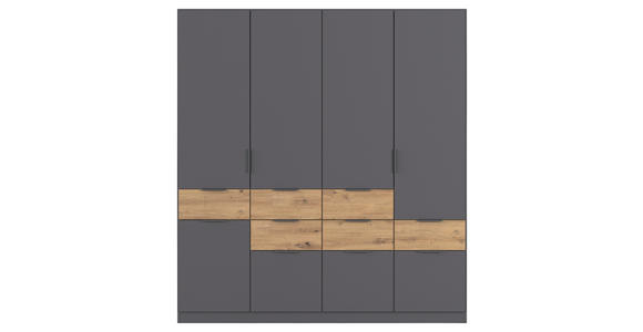 Dunkelgraue Fronten und eichefarbene Schubladen harmonieren mit vielfältigen Wohnstilen von Industrial bis modern. Durch die gerade Formgebung und die dezenten Griffe erhält das Möbel einen aktuellen Look. Mit Maßen von ca. 181 x 197 x 54 cm (B x H x T) bietet das Möbel äußerst viel Stauraum auf verhältnismäßig geringer Stellfläche. Dieser XORA Drehtürenschrank (5-türig) in Grau mit Schubladen bringt Style und Funktion in Einklang!