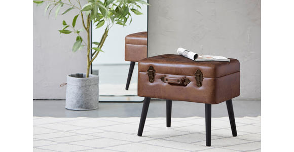 Kreative Einrichtungs-Genies und Vintage-Liebhaber aufgepasst: Dieser XORA Hocker mit Stauraum im Koffer-Design versprüht jede Menge Charme. Denn die Aufbewahrungsmöglichkeit des Möbels ist als Gepäckstück im Retro-Style getarnt. Der Bezug im braunen Wildlederlook passt perfekt zum nostalgischen Flair und ist mit liebevollen Details wie markanten Schnallen versehen. Ausgestellte Füße in Schwarz runden das Gesamtbild stimmig ab.